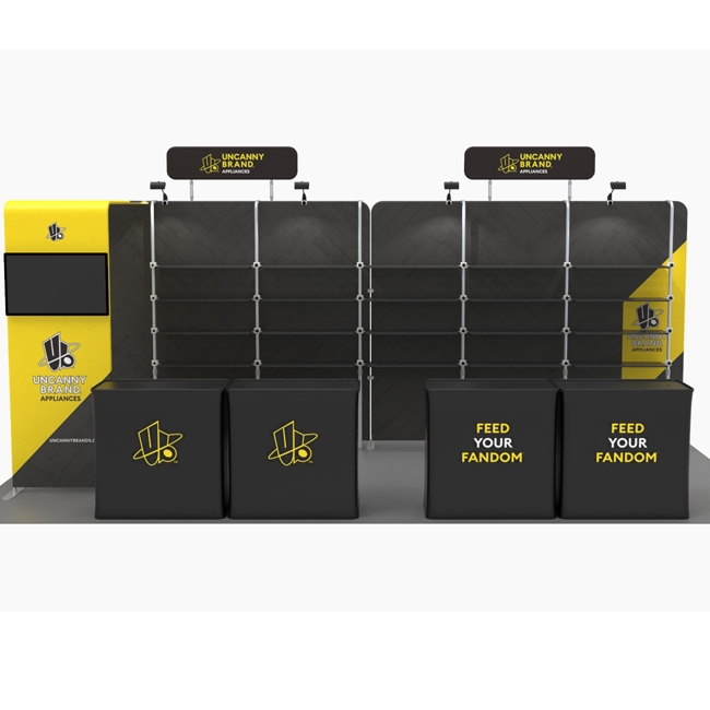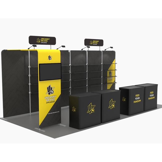 One of the key characteristics of this booth is its modular shelving. This unique booth design allows you to easily adjust and arrange the shelving to suit your specific needs, ensuring that your merchandise is front and center. Whether you’re displaying garments, accessories, or promotional items, this booth provides ample space to exhibit your offerings effectively.