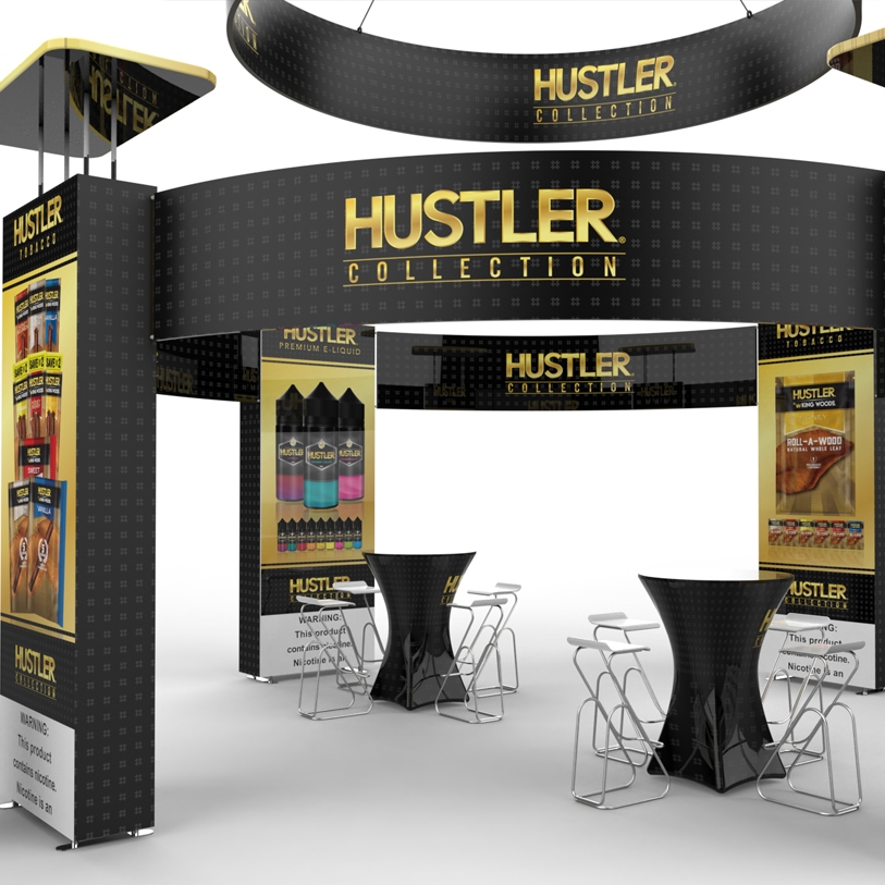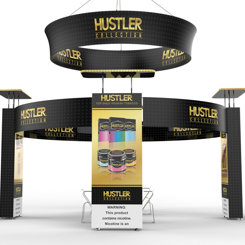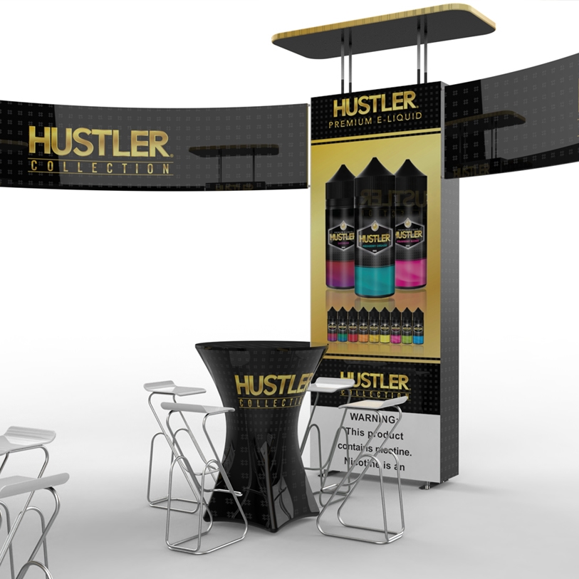 - The Hustler Booth utilizes tall towers, a large printed Hanging sign will make your display stand out in any environment.