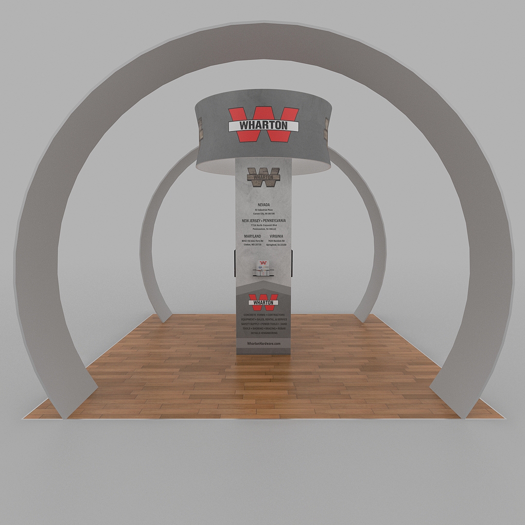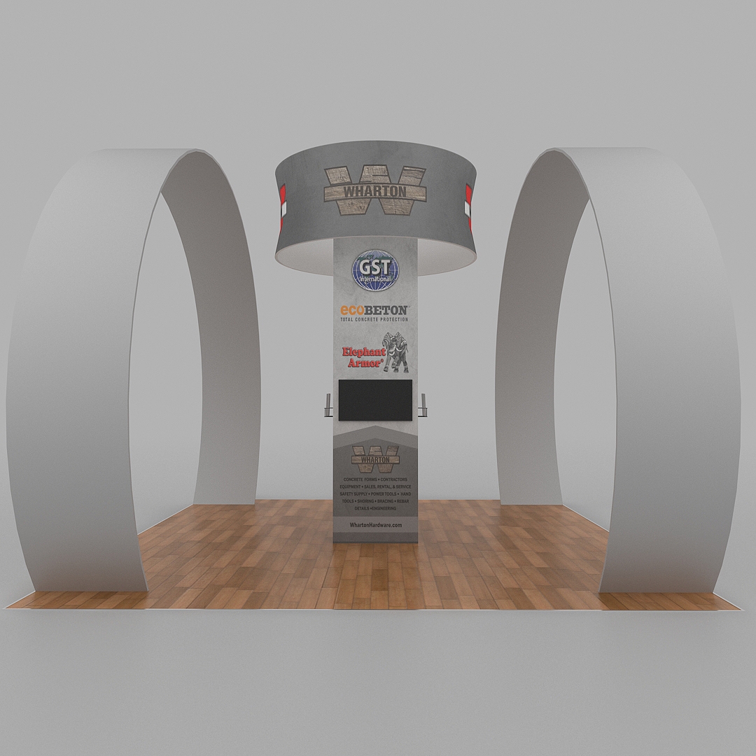• Features a tall central tower that provides 360-degree brand visibility across the entire convention hall.