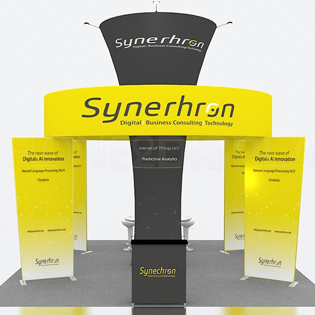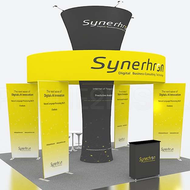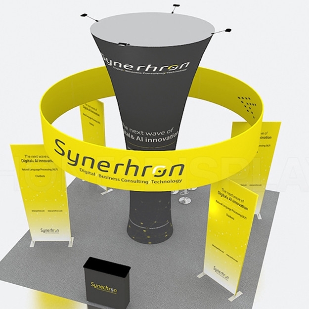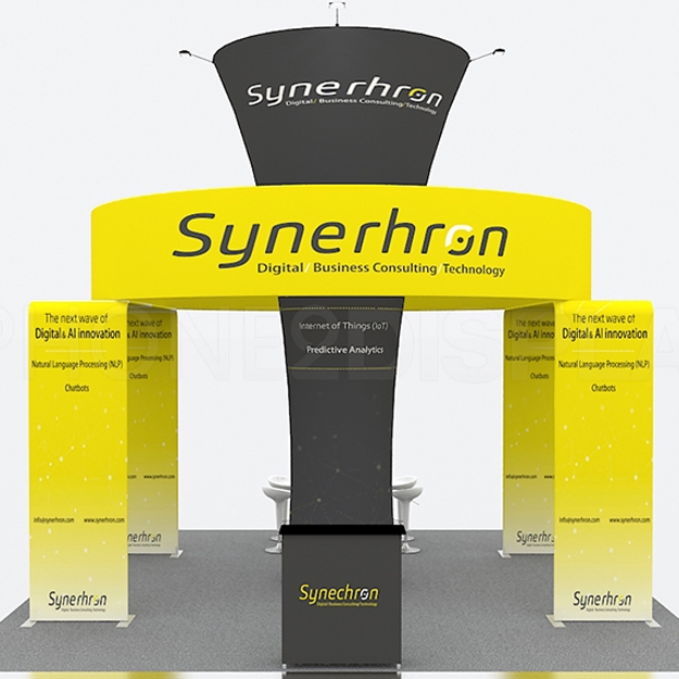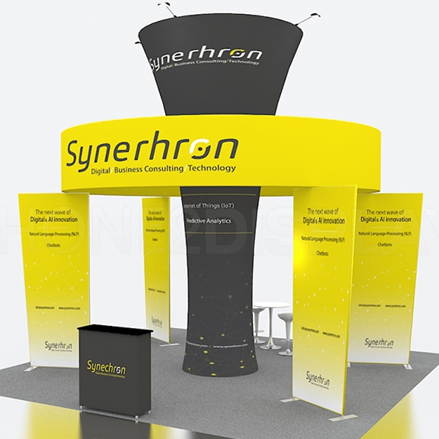 20X20 Synerhron Tension Fabric Exhibit Booth This low cost 20×20 Tension Fabric Exhibit Display is a great alternative to 20×20 Modular Trade Show Displays that can cost up to 3 times the cost of this display. This is a turnkey solution that incorporates Interactive media by utilizing LED monitors available at each corner,